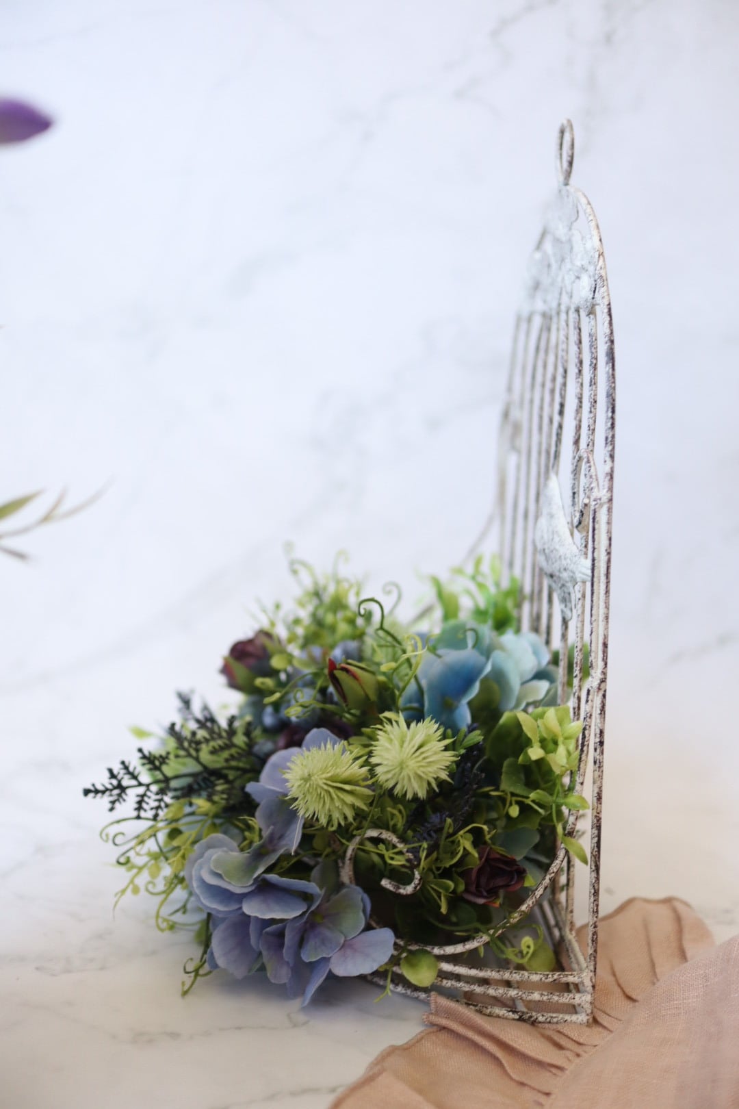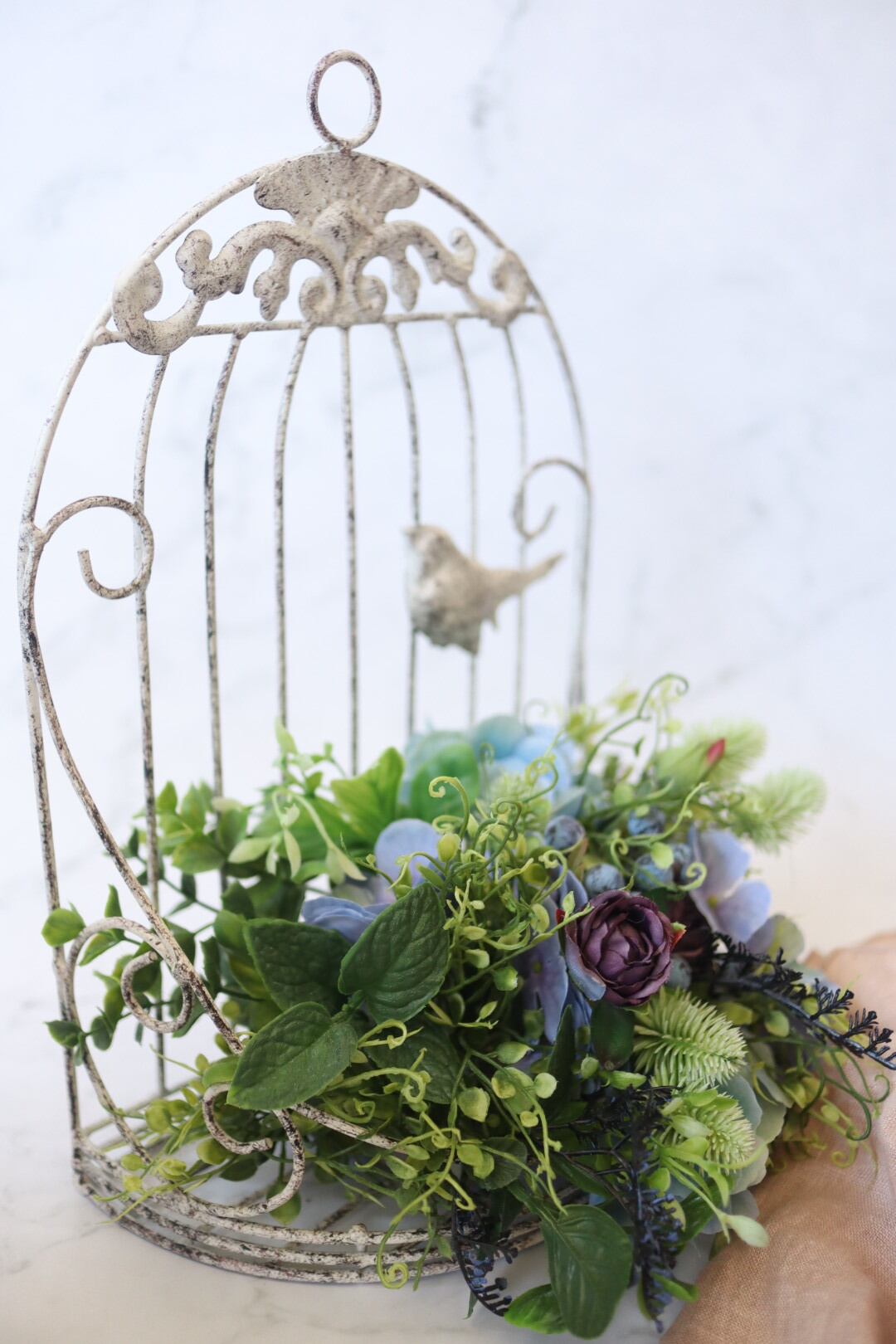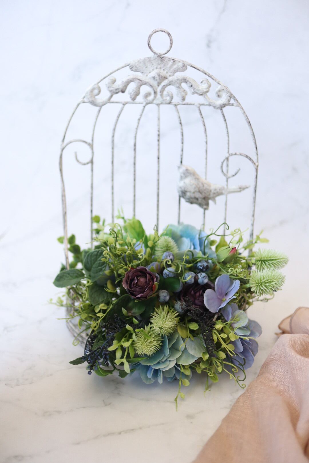 シックなブルー系のお花とたっぷりのグリーンを使った鳥かごのアレンジです。