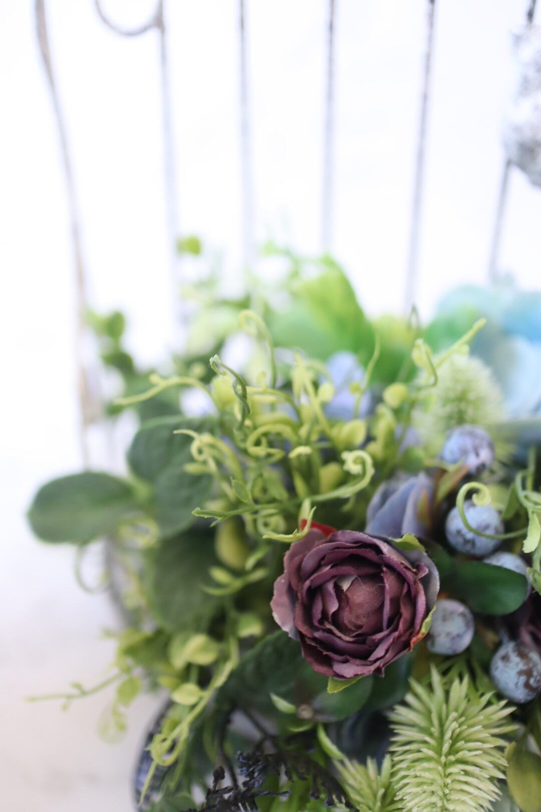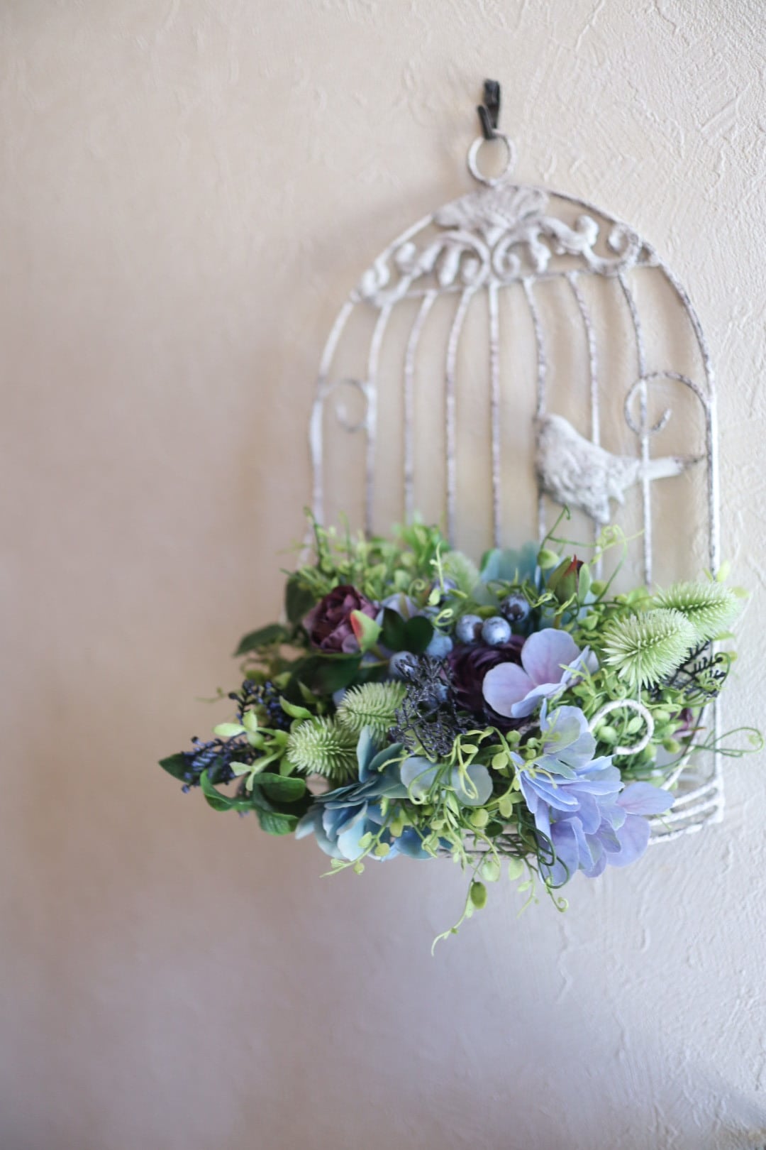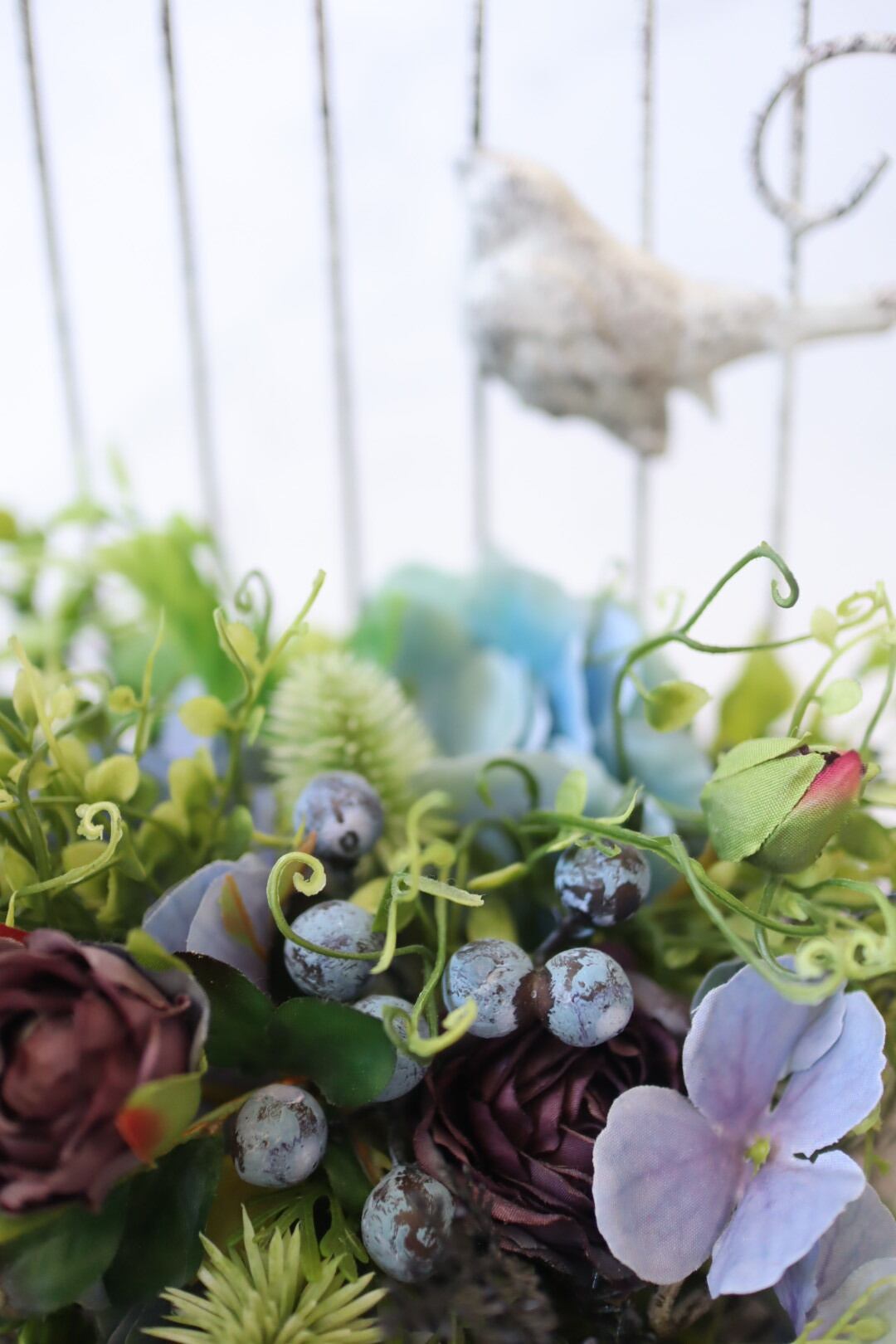 シックなブルー系のお花とたっぷりのグリーンを使った鳥かごのアレンジです。