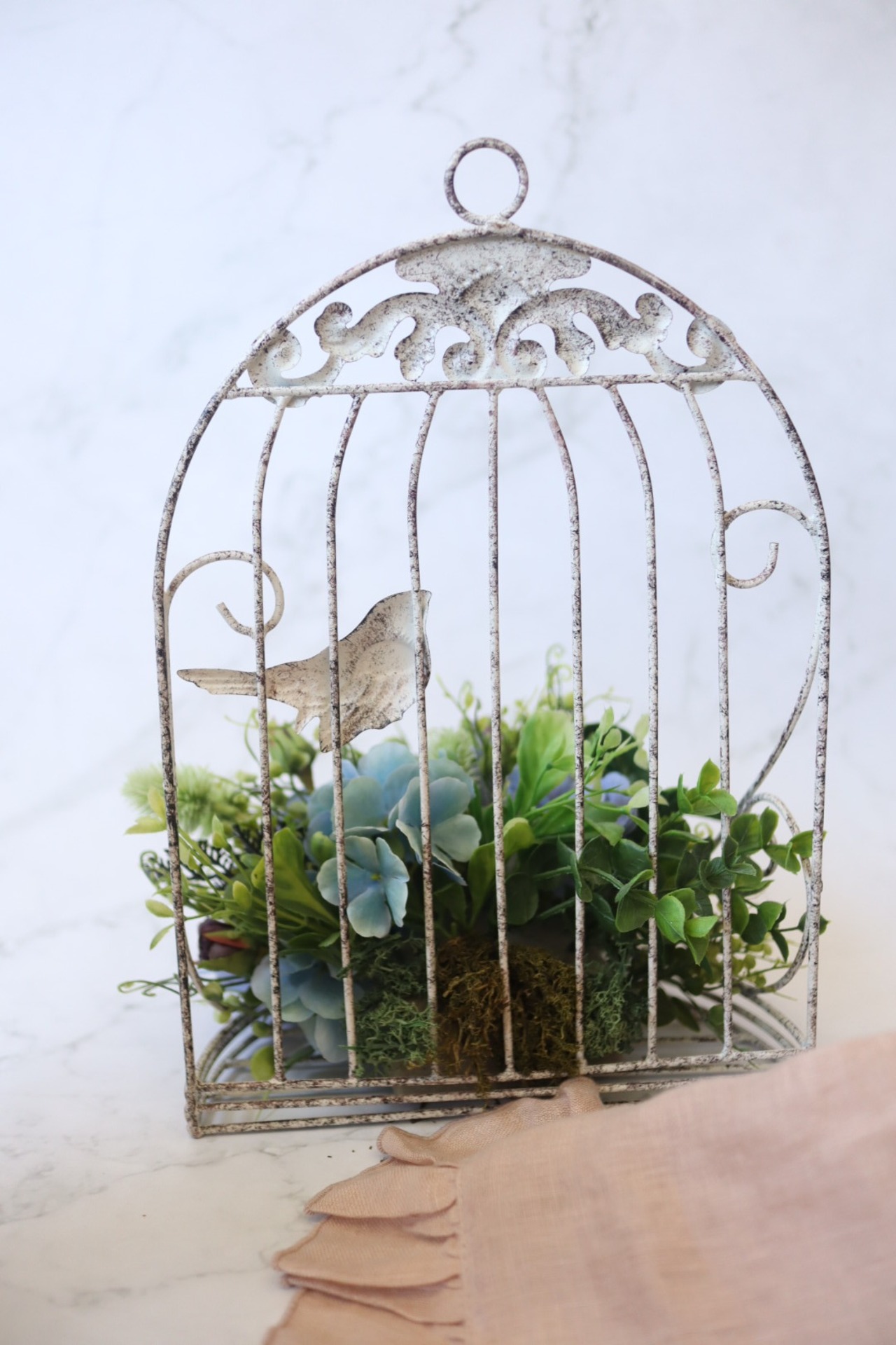 ベースの鳥かごはアンティーク感のある白。