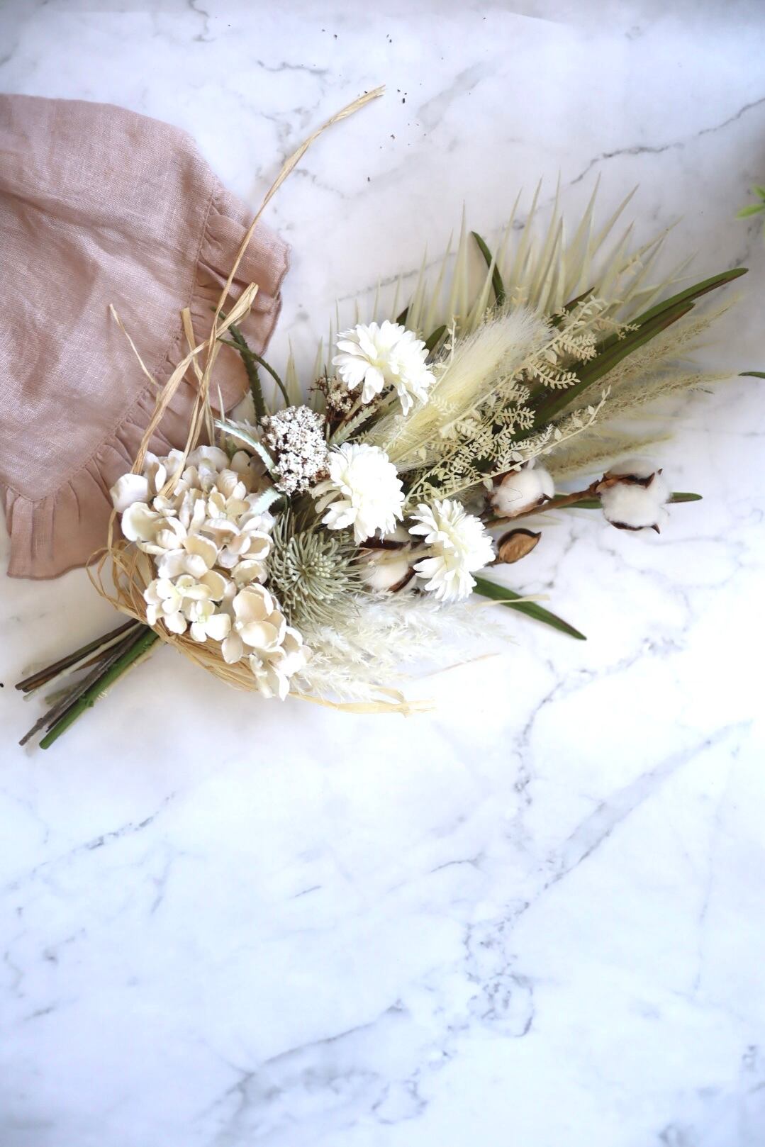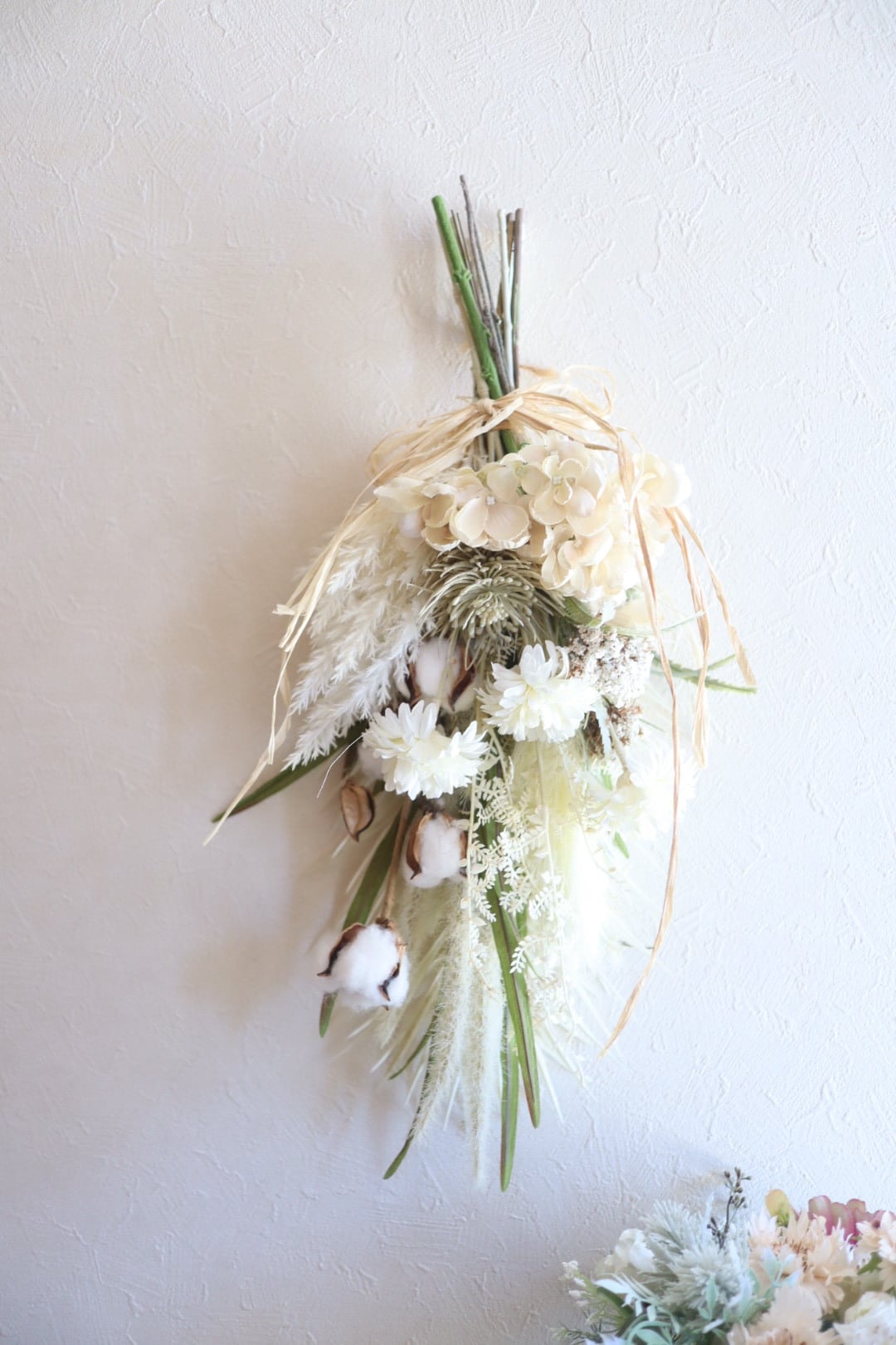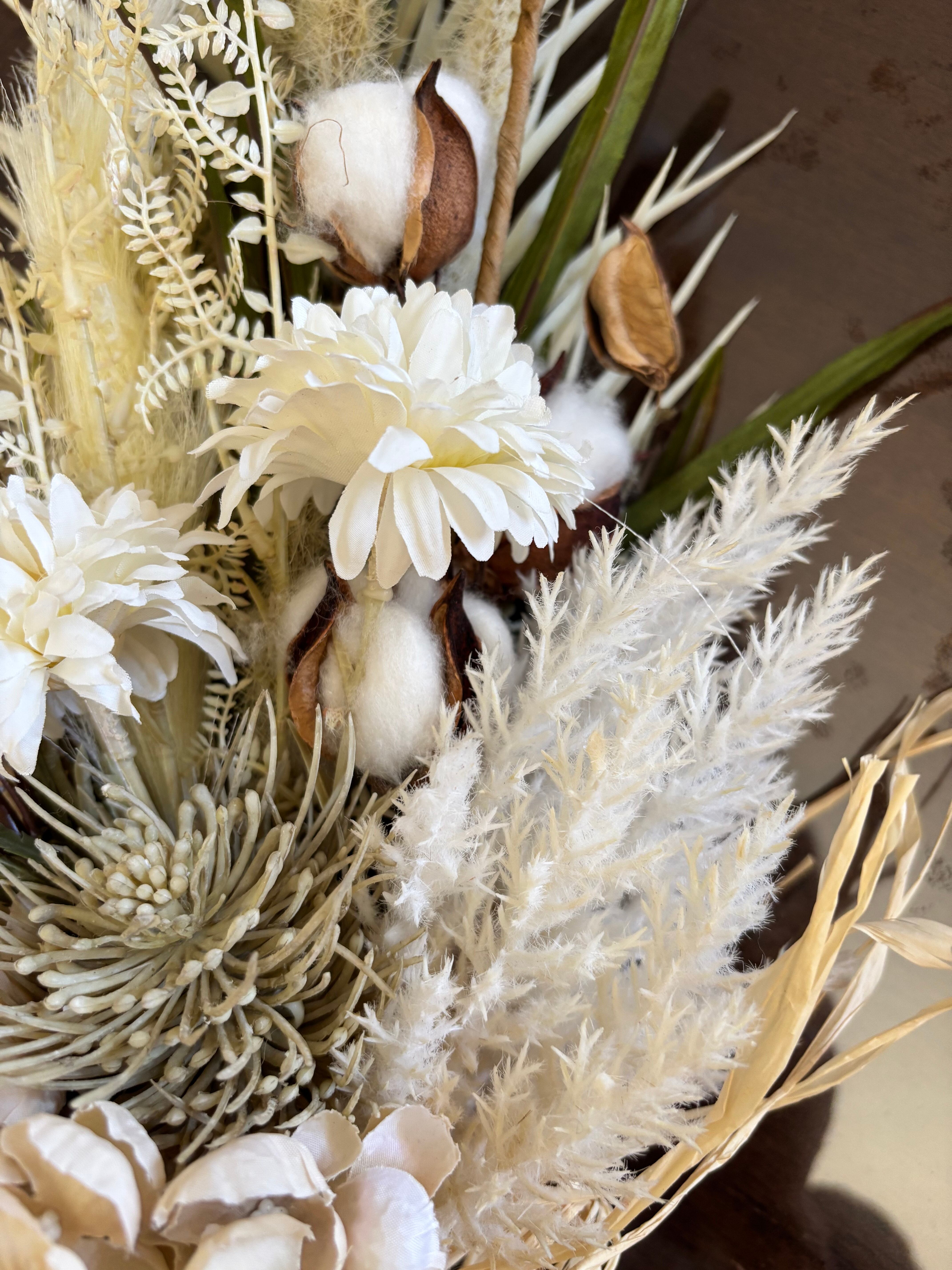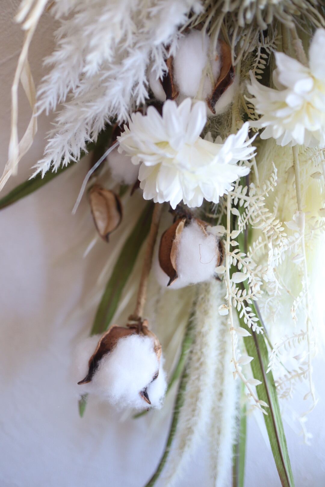 コットンフラワー、グラミネ(麦の穂のような)などをたっぷり使っています