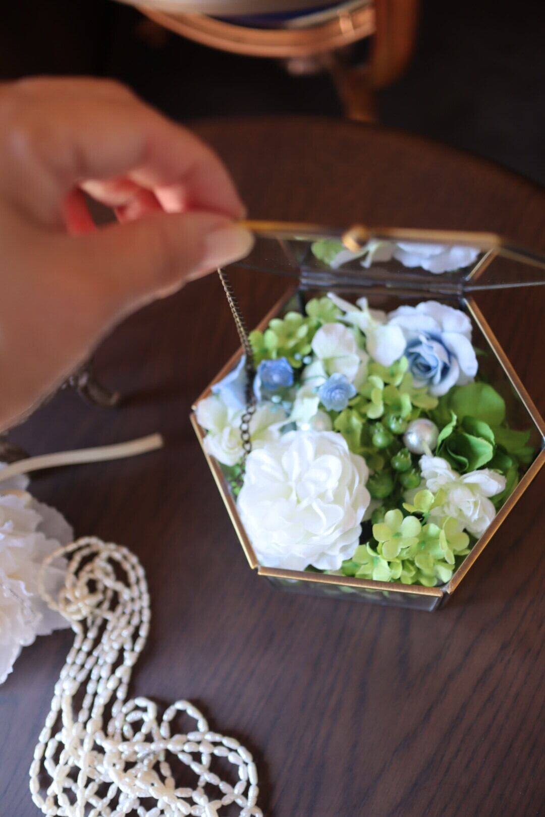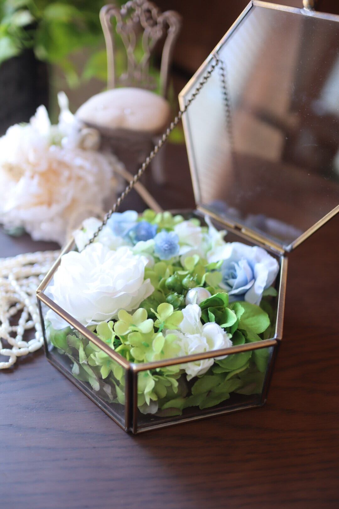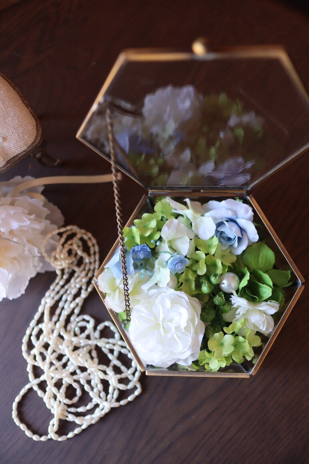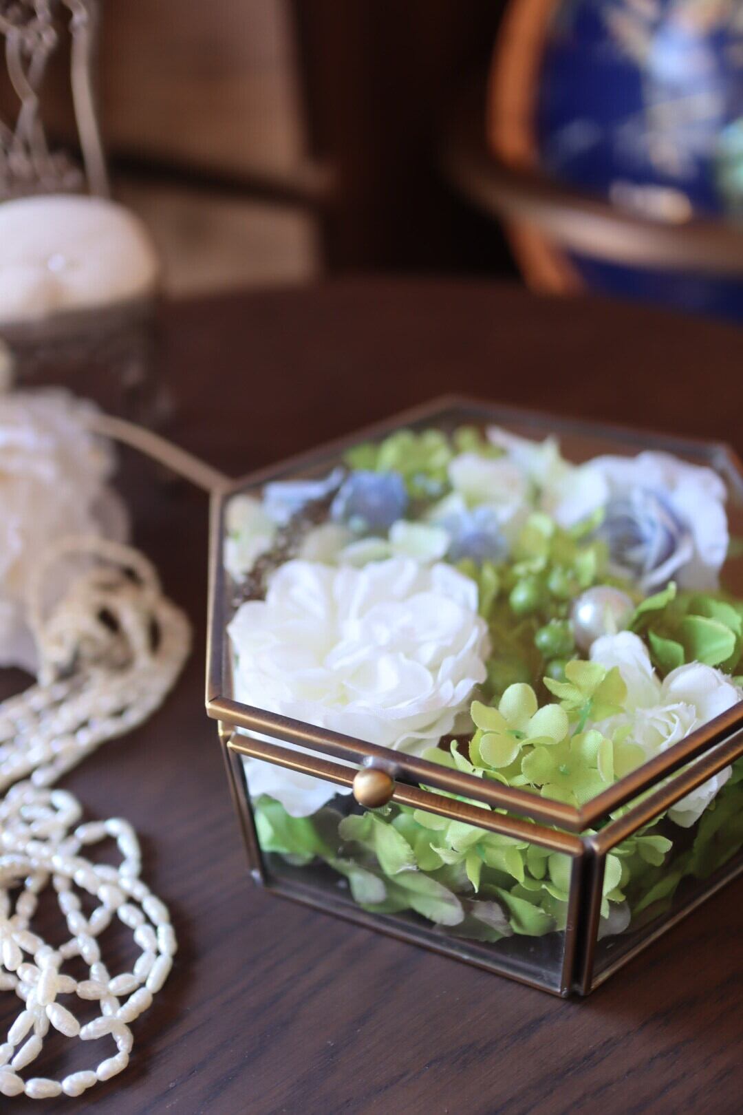 ガラスの六角形の小物入れの中に白、ブルーのバラや紫陽花を閉じ込めました。