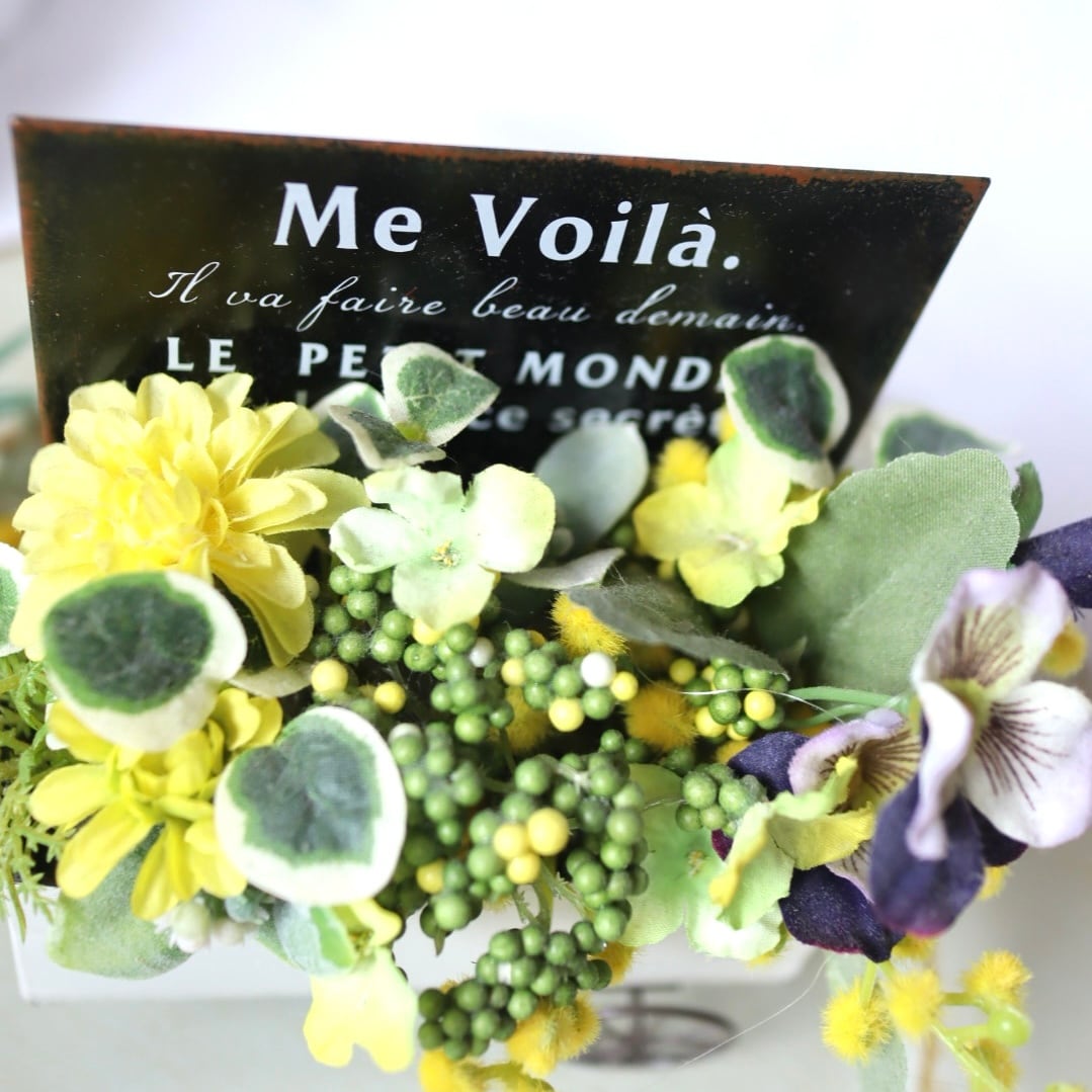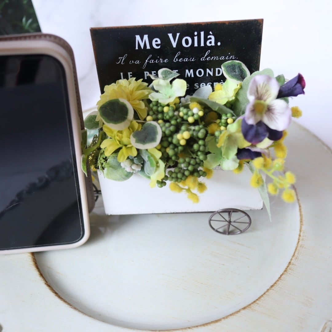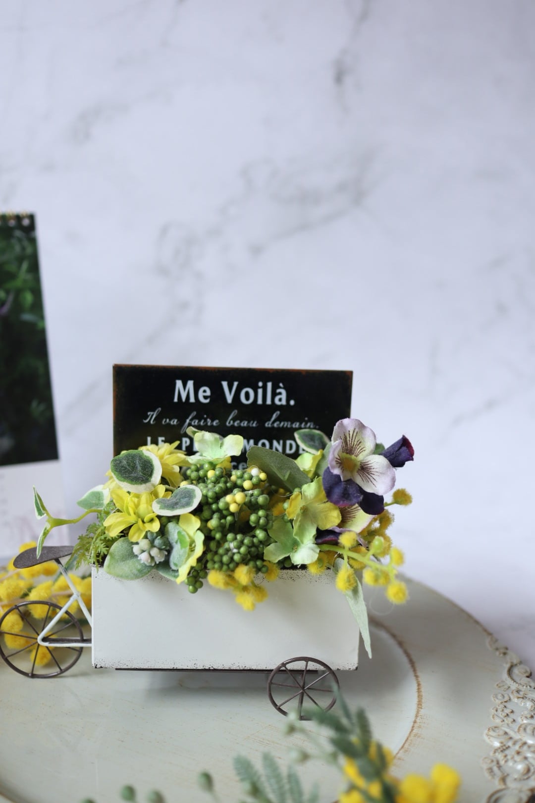 白い荷台にレモンイエローの小花とミモザ、ビオラを乗せた、ミニミニ自転車のアレンジです。
