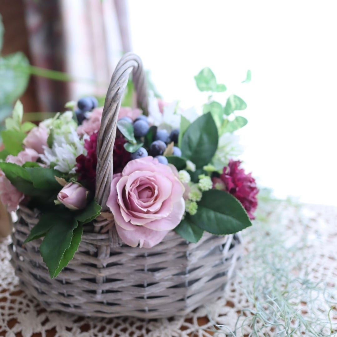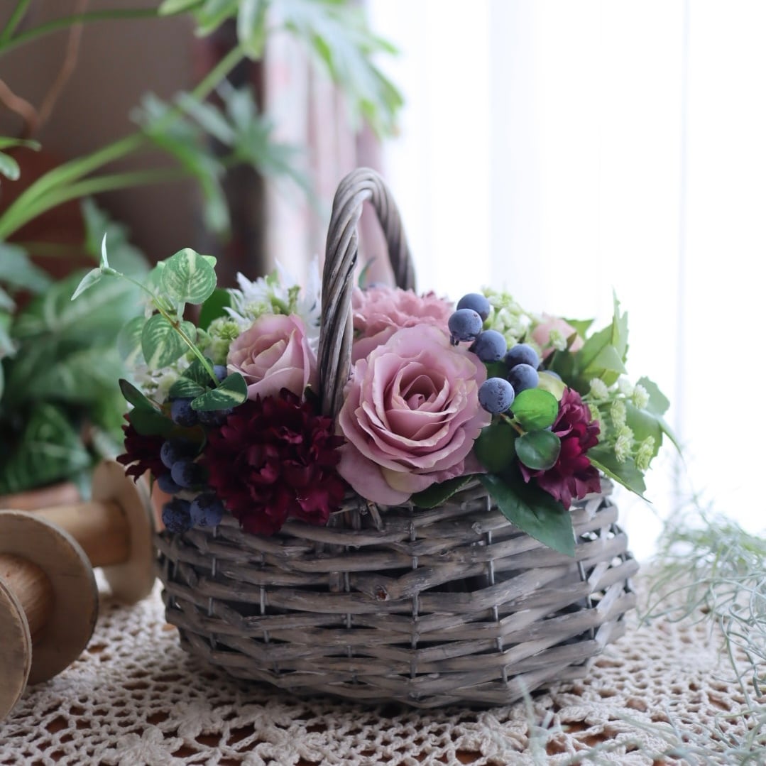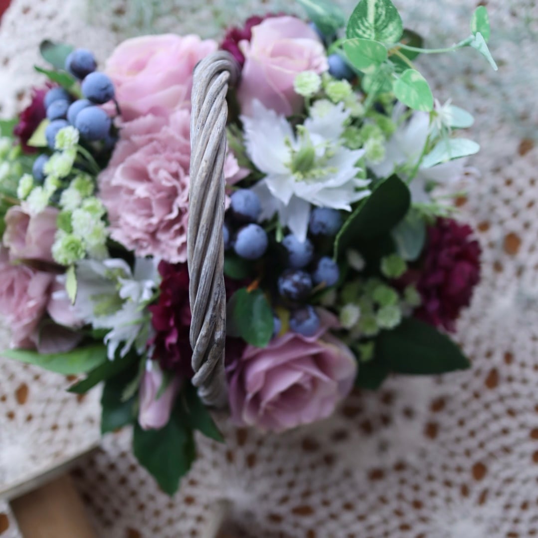 ギフトとしてちょうどいいサイズ感の、バスケットアレンジです。