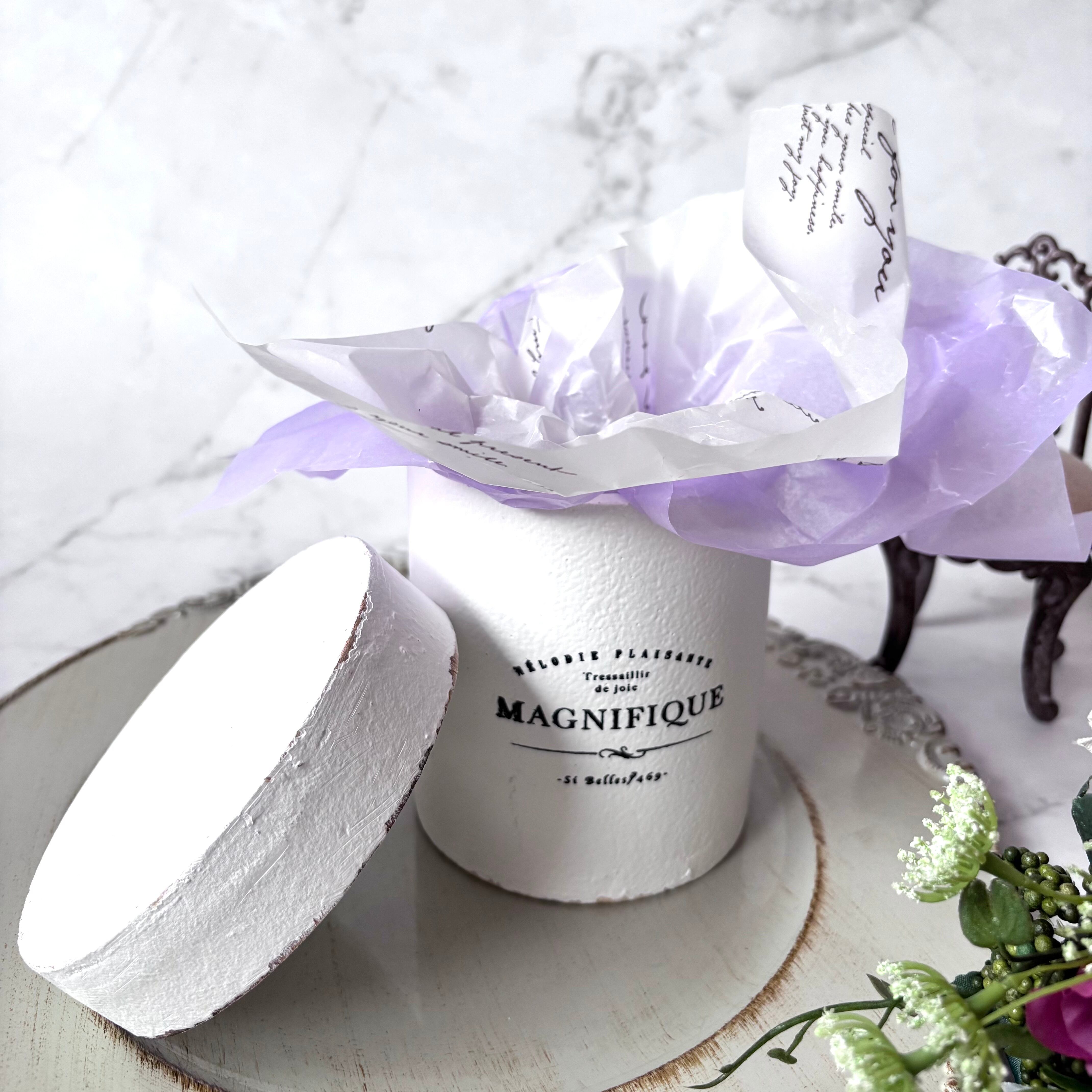 白い花器は木製で下の部分が蓋になっています。