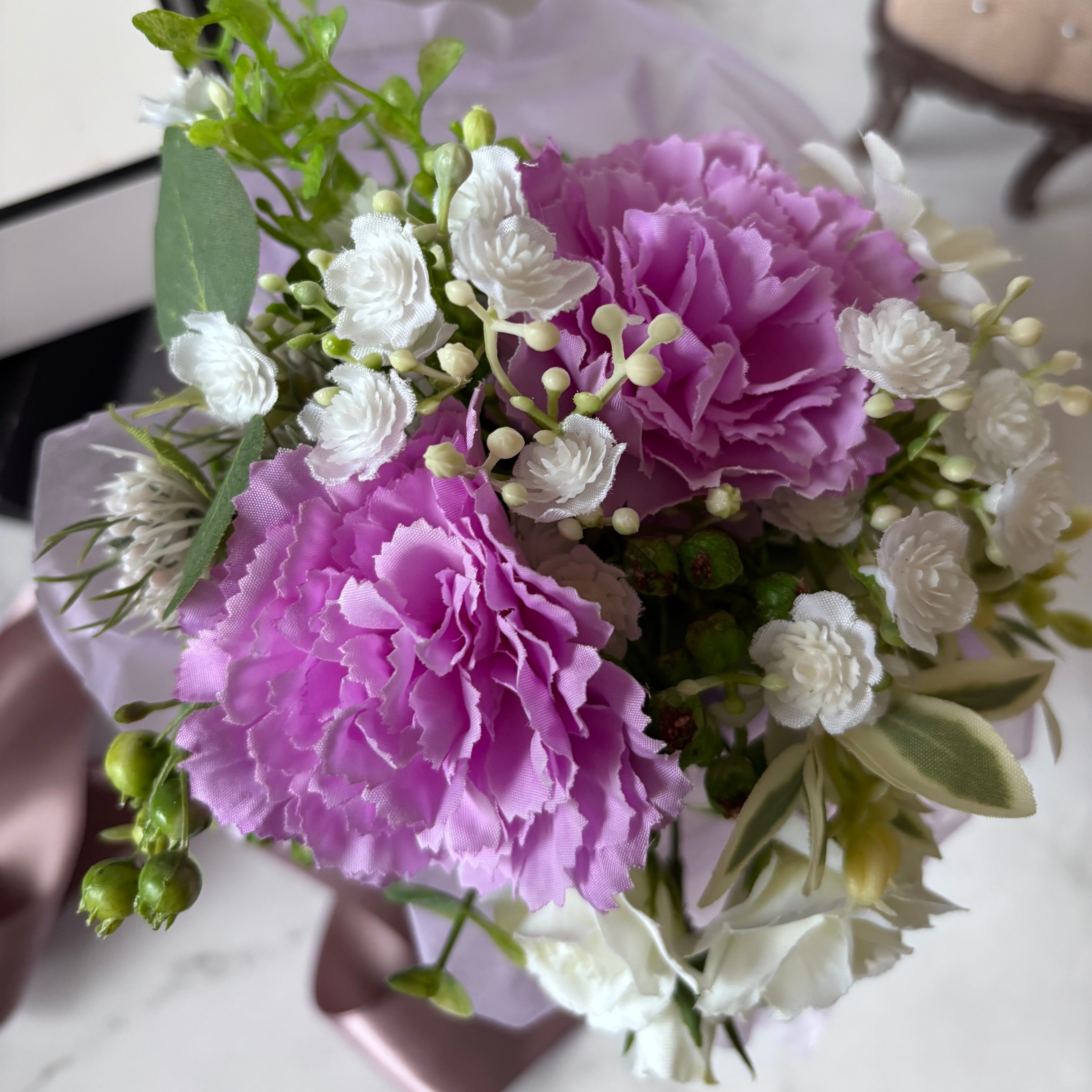 母の日に使いやすいアーティフィシャルフラワーのミニブーケです。